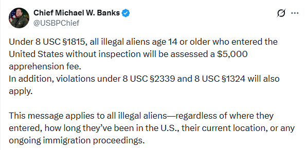 Banks escribió en X: “A todos los inmigrantes ilegales mayores de 14 años que ingresen a los Estados Unidos sin inspección se les aplicará una tarifa de aprehensión de 5.000 dólares”, de acuerdo con lo establecido por el “Gran y hermoso proyecto de ley” que presentó el presidente Donald Trump y que fue aprobado meses atrás.