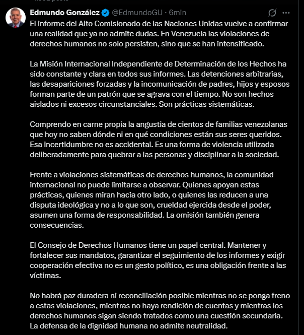 A través de un mensaje difundido en su cuenta oficial de X (antes Twitter), González afirmó que el documento vuelve a confirmar una realidad “que ya no admite dudas” y respaldó las conclusiones de la Misión Internacional Independiente de Determinación de los Hechos, la cual ha señalado de forma reiterada la existencia de prácticas sistemáticas como detenciones arbitrarias, desapariciones forzadas e incomunicación prolongada de familiares.