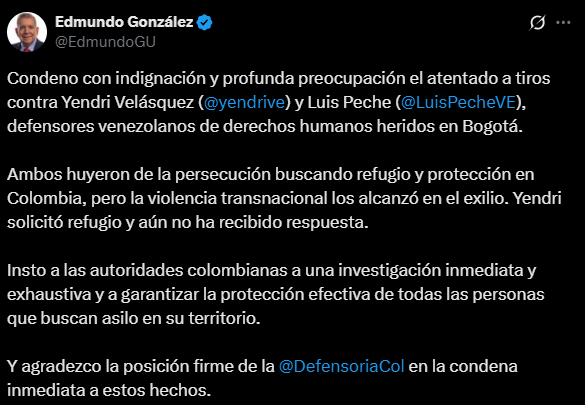 El líder opositor Edmundo González Urrutia condenó con «indignación y profunda preocupación» el atentado a tiros contra los activistas Yendri Velásquez y Luis Peche en Bogotá, y exigió a las autoridades colombianas una investigación inmediata y la garantía de «protección efectiva» para todos los venezolanos que buscan asilo en ese país.
