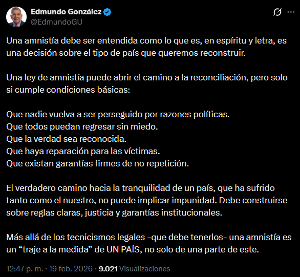 El líder democrático Edmundo González Urrutia pidió este jueves que la ley de amnistía que se apruebe en Venezuela debe cumplir unas «condiciones básicas» que garanticen la no repetición, que nadie vuelva a ser perseguido y la reparación de las víctimas, pues el «camino hacia la tranquilidad (…) no puede implicar impunidad».