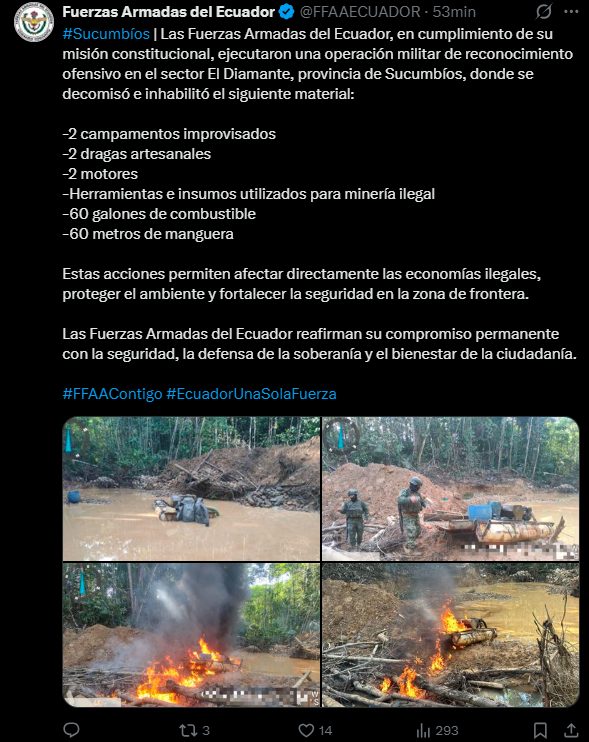 Las operaciones militares contra la minería ilegal se han intensificado en los últimos meses en Ecuador, especialmente después de que once soldados fueran asesinados el 9 de mayo en una emboscada mientras realizaban un operativo en la Amazonía, un ataque atribuido a los Comandos de la Frontera, grupo disidente de la extinta guerrilla de las Fuerzas Armadas Revolucionarias de Colombia (Farc), que negaron su participación.