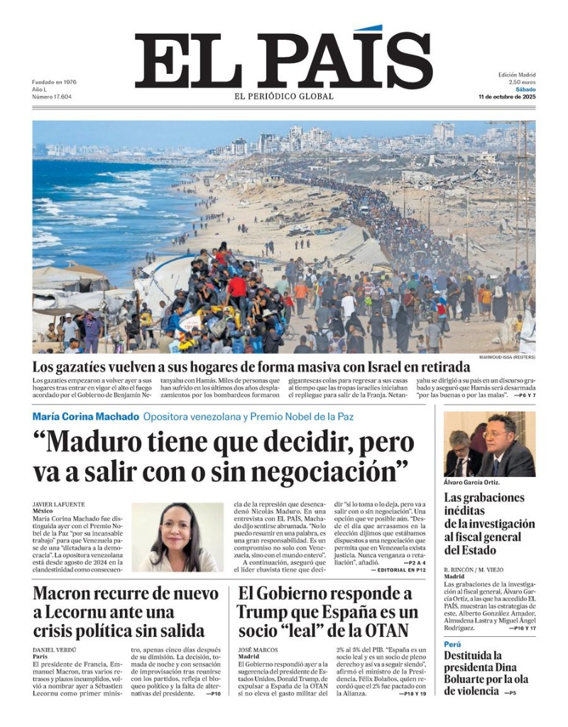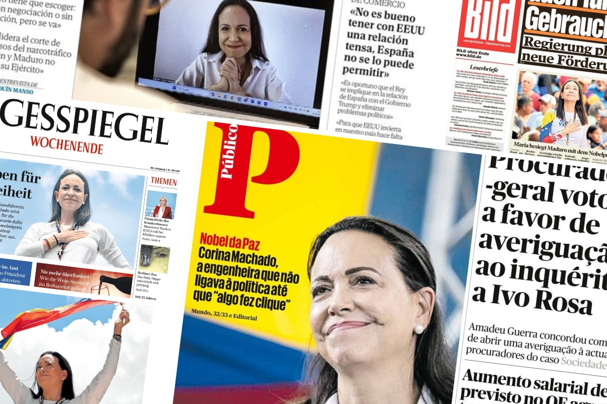 El histórico Premio Nobel de la Paz otorgado este viernes a la dirigente venezolana María Corina Machado se convirtió de inmediato en una noticia de primera plana en los principales periódicos del mundo. Medios de España, Alemania, Italia, Portugal y Reino Unido, entre otros, destacaron el galardón en sus portadas con una diversidad de enfoques, desde entrevistas exclusivas hasta agudos análisis políticos.