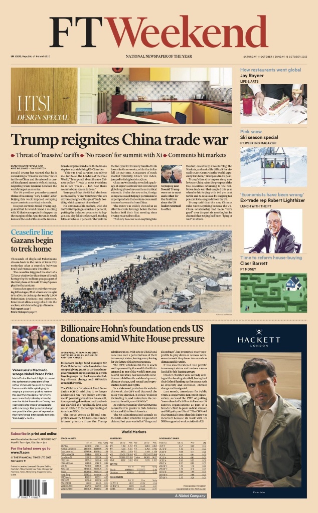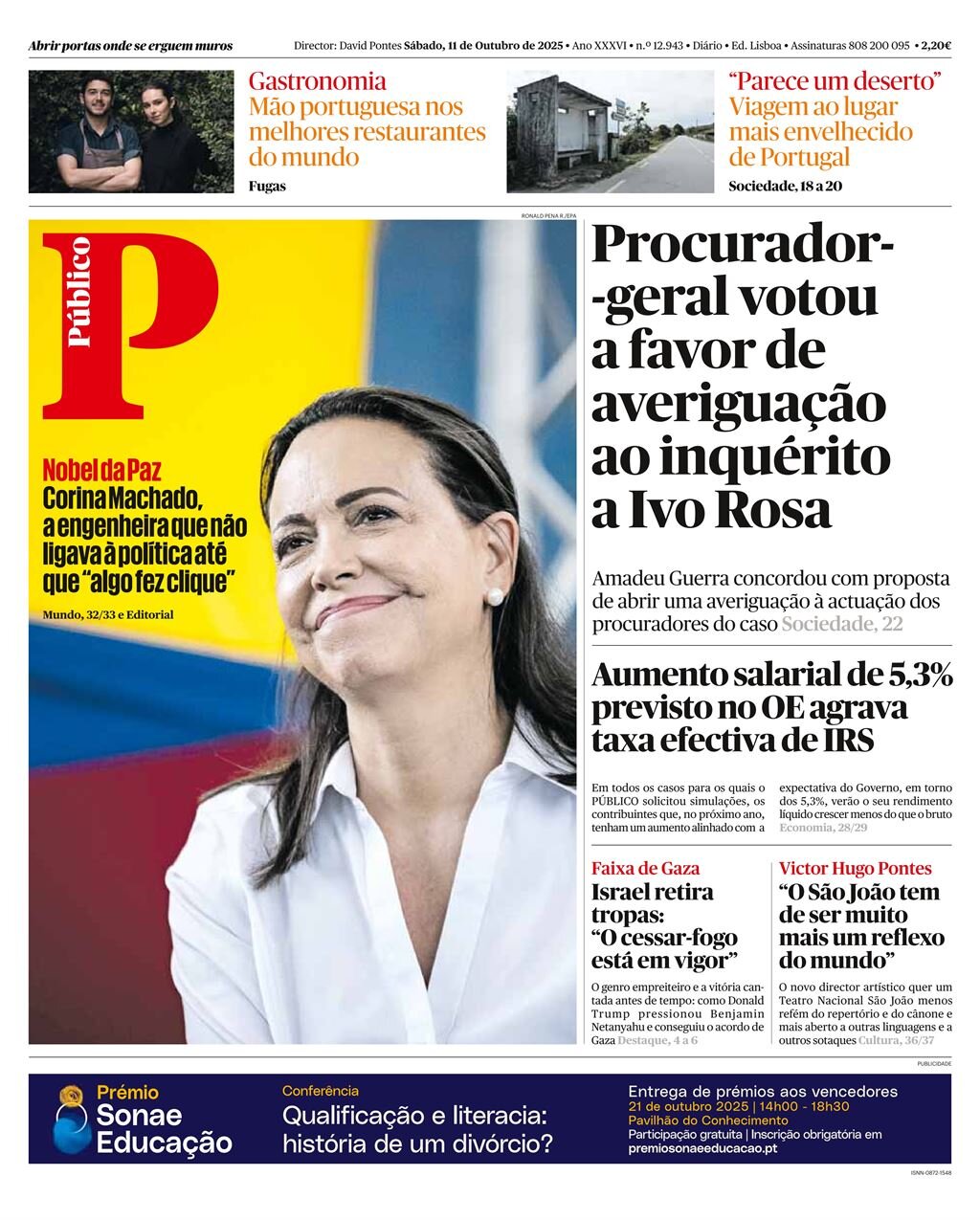 El diario Público de Portugal eligió un perfil biográfico: «Corina Machado, la ingeniera a la que no le importaba la política hasta que ‘algo hizo clic'». El prestigioso Financial Times Weekend del Reino Unido también recogió la noticia en su portada, informando que «La venezolana Machado gana el Premio Nobel de la Paz» y que el premio da un «nuevo ímpetu» a la oposición.