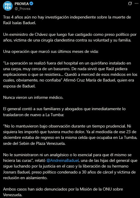 La ONG Programa Venezolano de Educación Acción en Derechos Humanos (Provea) denunció este domingo que han pasado cuatro años desde la muerte del general Raúl Isaías Baduel, exministro de Hugo Chávez y preso político, y aún no existe una investigación independiente sobre las circunstancias del caso.