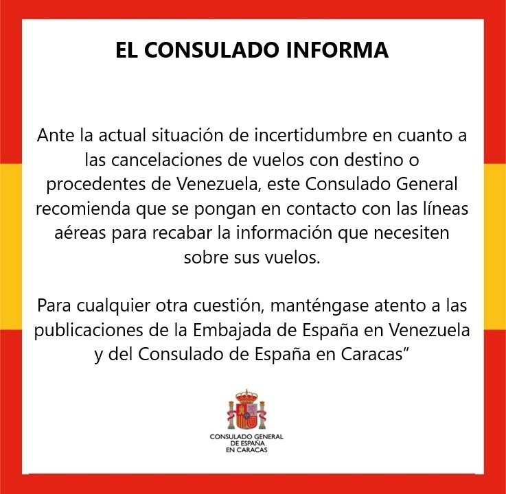 «Ante la actual situación de incertidumbre en cuanto a las cancelaciones de vuelos con destino o procedentes de Venezuela, este Consulado General recomienda que se pongan en contacto con las líneas aéreas para recabar la información que necesiten sobre sus vuelos», indicó el organismo en su comunicado.