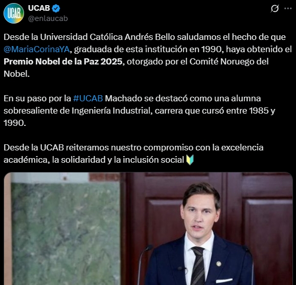La Universidad Católica Andrés Bello (UCAB) emitió este viernes 10 de octubre un pobre comunicado en el que se pronuncia sobre el Premio Nobel de la Paz 2025 otorgado a la líder de la oposición democrática María Corina Machado, quien es egresada de esa casa de estudios.