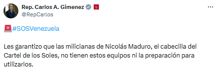 En una publicación en X, Giménez compartió imágenes del Departamento de Defensa de EE. UU. que exhiben el sofisticado equipo de vigilancia y las municiones de última generación utilizadas en la operación.
