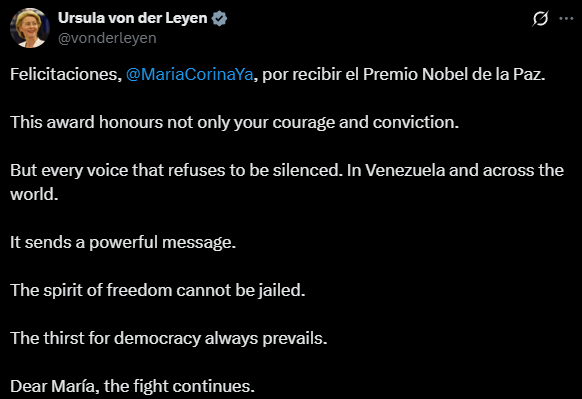 «Felicitaciones, María Corina, por recibir el Premio Nobel de la Paz. Este premio honra no sólo su coraje y convicción», expresó von der Leyen en sus redes sociales.