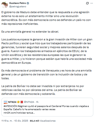 El mensaje de Petro se produjo tras citar la noticia sobre la retención del pasaporte al Cardenal Porras por parte del régimen de Maduro cuando se disponía a viajar a España.