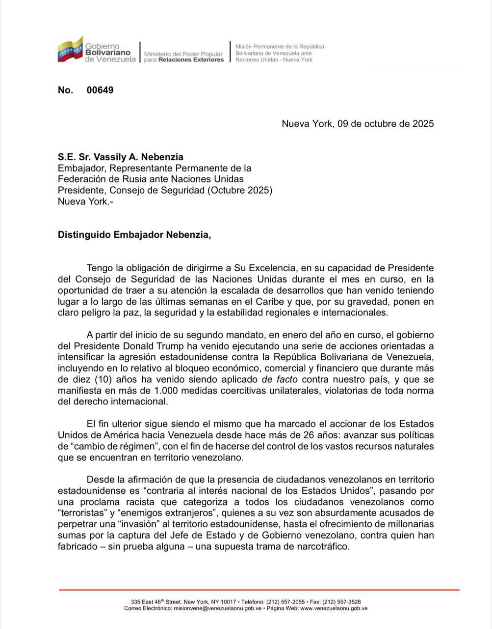 El régimen de Nicolás Maduro solicitó formalmente este jueves 9 de octubre una reunión de urgencia del Consejo de Seguridad de las Naciones Unidas para denunciar lo que califica como una «grave escalada de agresiones y despliegue militar sin precedentes» por parte de Estados Unidos en el mar Caribe. La petición argumenta que estas acciones ponen en «claro peligro» la paz y la seguridad de la región.