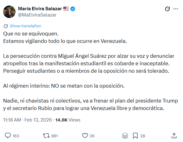 La congresista estadounidense María Elvira Salazar aseguró este viernes 13 de febrero que la administración de Estados Unidos mantiene una vigilancia activa sobre los eventos recientes en Venezuela, tras denunciar el hostigamiento hacia el dirigente estudiantil Miguelangel Suárez.