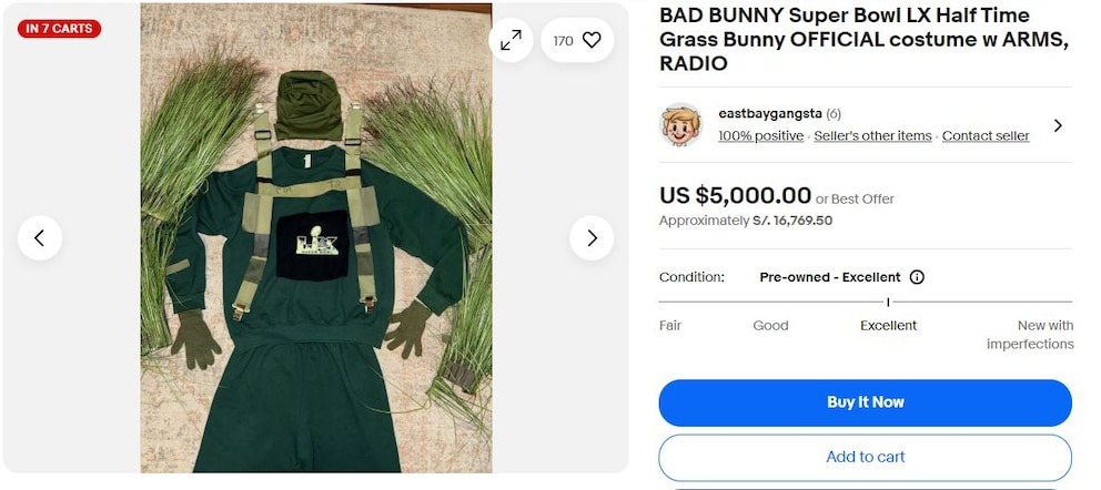 Según la descripción del vendedor, el conjunto se ofrece como el “Bad Bunny Super Bowl LX Half Time Show Grass Bunny OFFICIAL costume” y se encuentra en talla mediana y en “excelente” estado.
