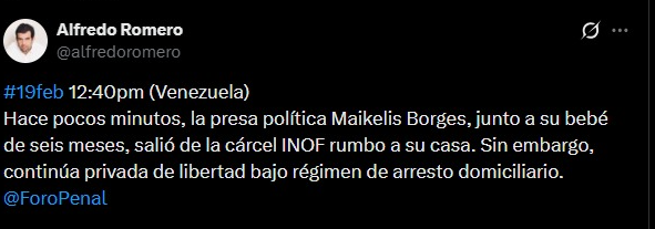 Según el presidente directo de la organización defensora de derechos humanos Foro Penal, Alfredo Romero, confirmó que a la mujer de 26 años de edad se le otorgó la medida de casa por cárcel.