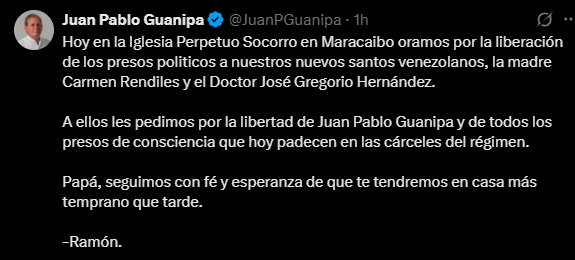 “Hoy en la Iglesia Perpetuo Socorro en Maracaibo oramos por la liberación de los presos políticos a nuestros nuevos santos venezolanos, la madre Carmen Rendiles y el Doctor José Gregorio Hernández. A ellos les pedimos por la libertad de Juan Pablo Guanipa y de todos los presos de consciencia que hoy padecen en las cárceles del régimen. Papá, seguimos con fe y esperanza de que te tendremos en casa más temprano que tarde”, escribió Ramón.