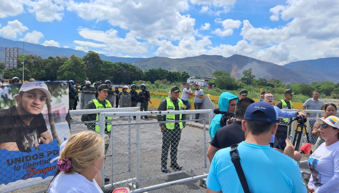 Convocados bajo el lema «¡Libérenlos!», madres, padres, esposas e hijos se reunieron en la mitad del paso fronterizo con pancartas, fotografías y banderas de Colombia para exigir la libertad de al menos 40 connacionales que, según denuncian, fueron detenidos de forma arbitraria por las autoridades venezolanas.