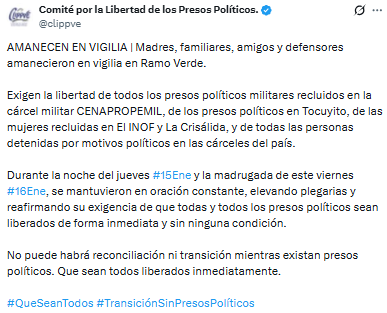 Desde la noche del jueves 15 de enero y durante la madrugada de este viernes, un grupo de madres, amigos y defensores de derechos humanos se concentraron en las inmediaciones del Centro Nacional de Procesados Militares, conocido como Ramo Verde.