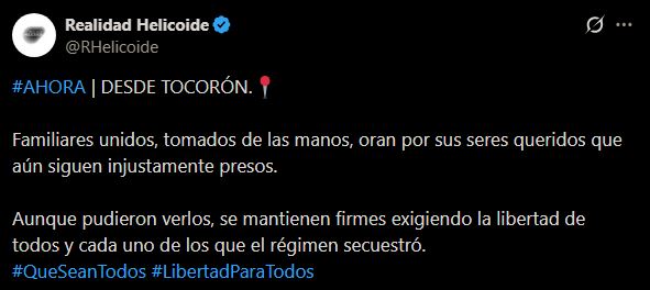“Familiares unidos, tomados de las manos, oran por sus seres queridos que aún siguen injustamente presos. Aunque pudieron verlos, se mantienen firmes exigiendo la libertad de todos y cada uno de los que el régimen secuestró”, escribió.