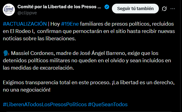La denuncia fue difundida en horas de la tarde a través de la cuenta oficial en X del Comité por la Libertad de los Presos Políticos (Clippve), acompañada de un video grabado por una familiar de privados de libertad, quien aseguró que más de 100 familias se mantienen pernoctando en el lugar desde el pasado 8 de enero.
