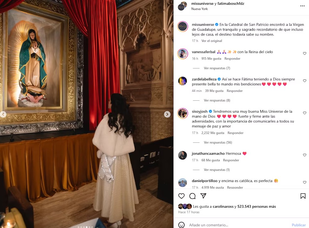 En la Catedral de San Patricio encontró a la Virgen de Guadalupe, un tranquilo y sagrado recordatorio de que incluso lejos de casa, el destino todavía sabe su nombre», publicó la Organización de Miss Universo en Instagram.