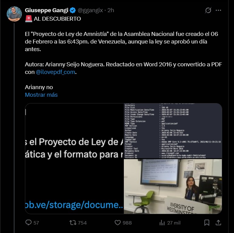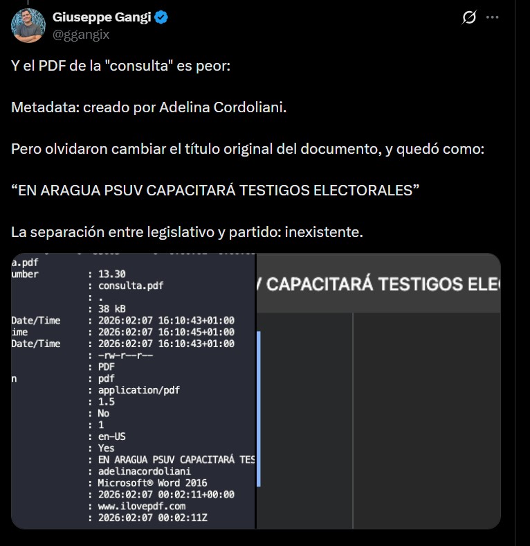 A través de su cuenta en X, Gangi informó que el documento publicado el viernes por Jorge Arreaza fue creado digitalmente el 06 de febrero a las 6:43 p. m. (hora de Venezuela), es decir, después de que la ley ya había sido aprobada en primera discusión, lo que genera serias dudas sobre el proceso real de elaboración del texto.