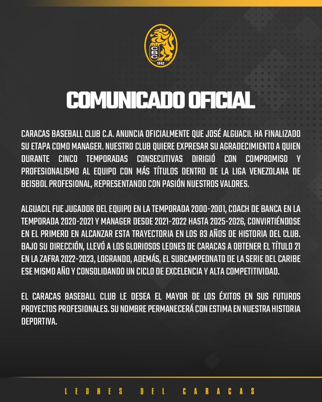 “Nuestro club quiere expresar su agradecimiento a quien durante cinco temporadas consecutivas dirigió con compromiso y profesionalismo al equipo con más títulos dentro de la Liga Venezolana de Béisbol Profesional, representando con pasión nuestros valores. El Caracas Baseball Club le desea el mayor de los éxitos en sus futuros proyectos profesionales. Su nombre permanecerá con estima en nuestra historia deportiva”, expresó la franquicia.
