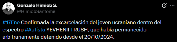 A través de X, el director vicepresidente de la organización, Gonzalo Himiob, precisó que Yevhenii Trush, quien dijo estaba «dentro del espectro autista», fue «arbitrariamente detenido» el 20 de octubre de 2024.