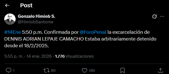 El Director Vicepresidente de la ONG Foro Penal, Gonzalo Himiob Santomé, confirmó a través de su cuenta oficial en X la excarcelación de Dennis Adrián Lepaje Camacho, quien permanecía detenido arbitrariamente desde el 18 de febrero de 2025.