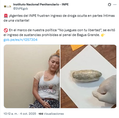 El Instituto Nacional Penitenciario de Perú frustró el miércoles 1 de octubre el intento de ingreso de sustancias prohibidas a una cárcel, deteniendo a una ciudadana venezolana que llevaba la droga oculta en sus partes íntimas.