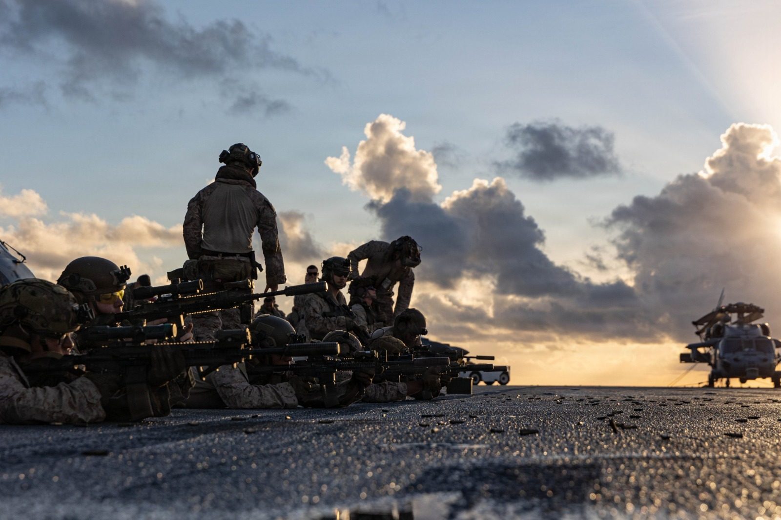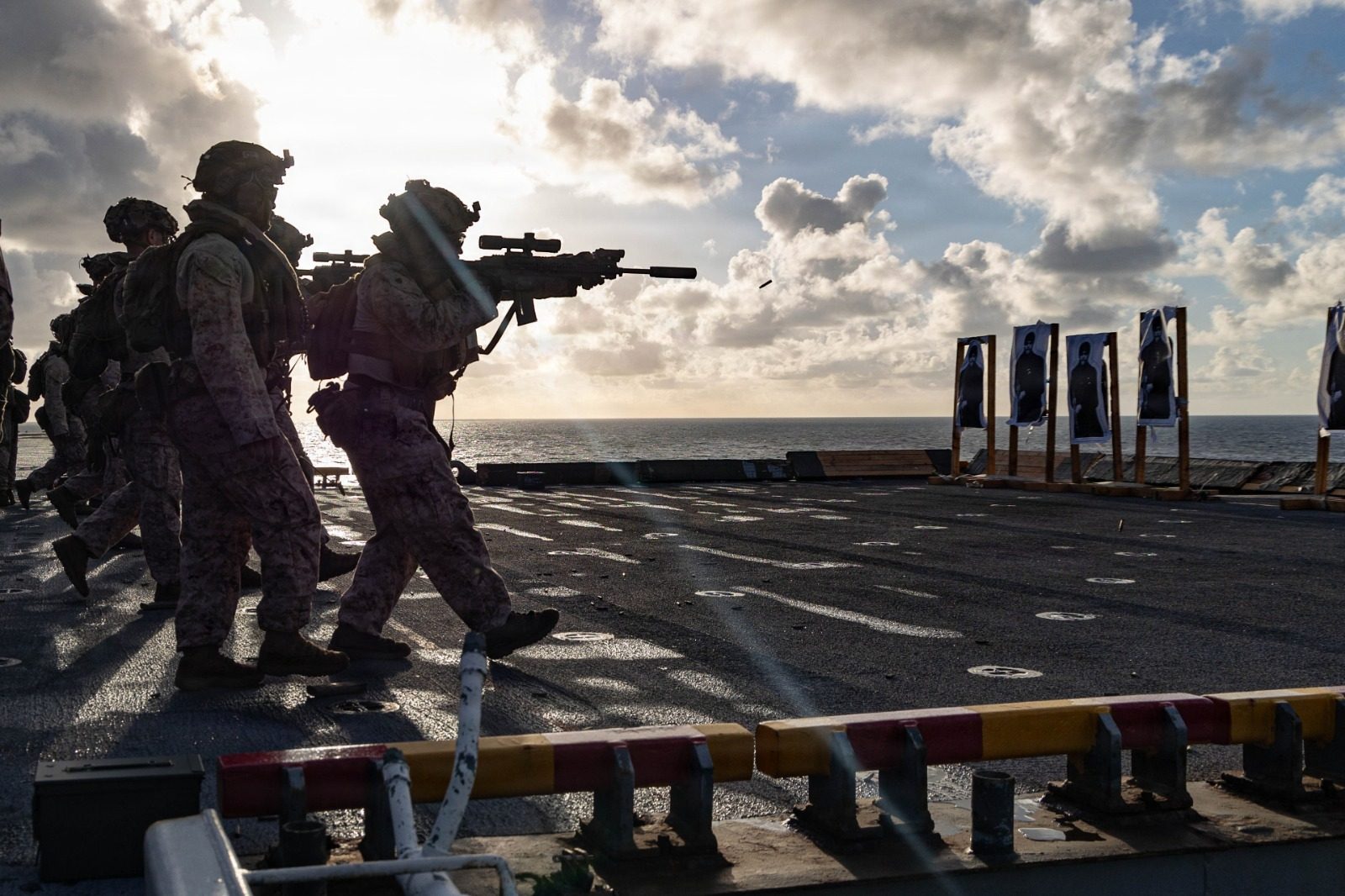 Oficiales de la 22da Unidad Expedicionaria de Marines (Capacidad de Operaciones Especiales), junto con el Equipo de Desembarco de Batallón 3/6, realizaron un ejercicio de tiro real en cubierta a bordo del buque de asalto anfibio USS Iwo Jima mientras patrullan por el mar Caribe.