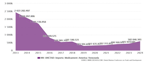 La magnitud de la caída del tráfico marino, más actualizada, son las importaciones de medicinas, que para el 2024 equivalen a una quinta parte del total del 2013, aunque superior al 2019.