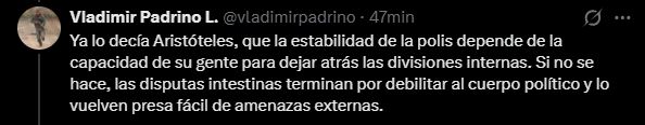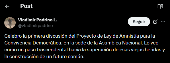El ministro de Defensa chavista, Vladimir Padrino López, publicó em sus redes sociales un extenso mensaje, valorando positivamente la aprobación en primera discusión del Proyecto de Ley de Amnistía para los presos políticos.