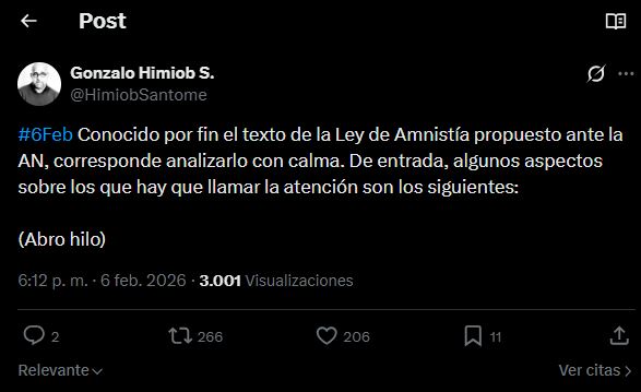 El abogado y director vicepresidente de la ONG Foro Penal, Gonzalo Himiob, se pronunció este viernes 6 de febrero a través de su cuenta oficial de X sobre el borrador de la Ley de Amnistía para presos políticos difundido por el diputado Luis Florido.