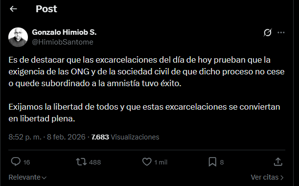 A través de un mensaje publicado en su cuenta oficial de X (antes Twitter), Himiob subrayó la importancia de que el proceso de excarcelaciones no se detenga ni quede condicionado a una eventual ley de amnistía.