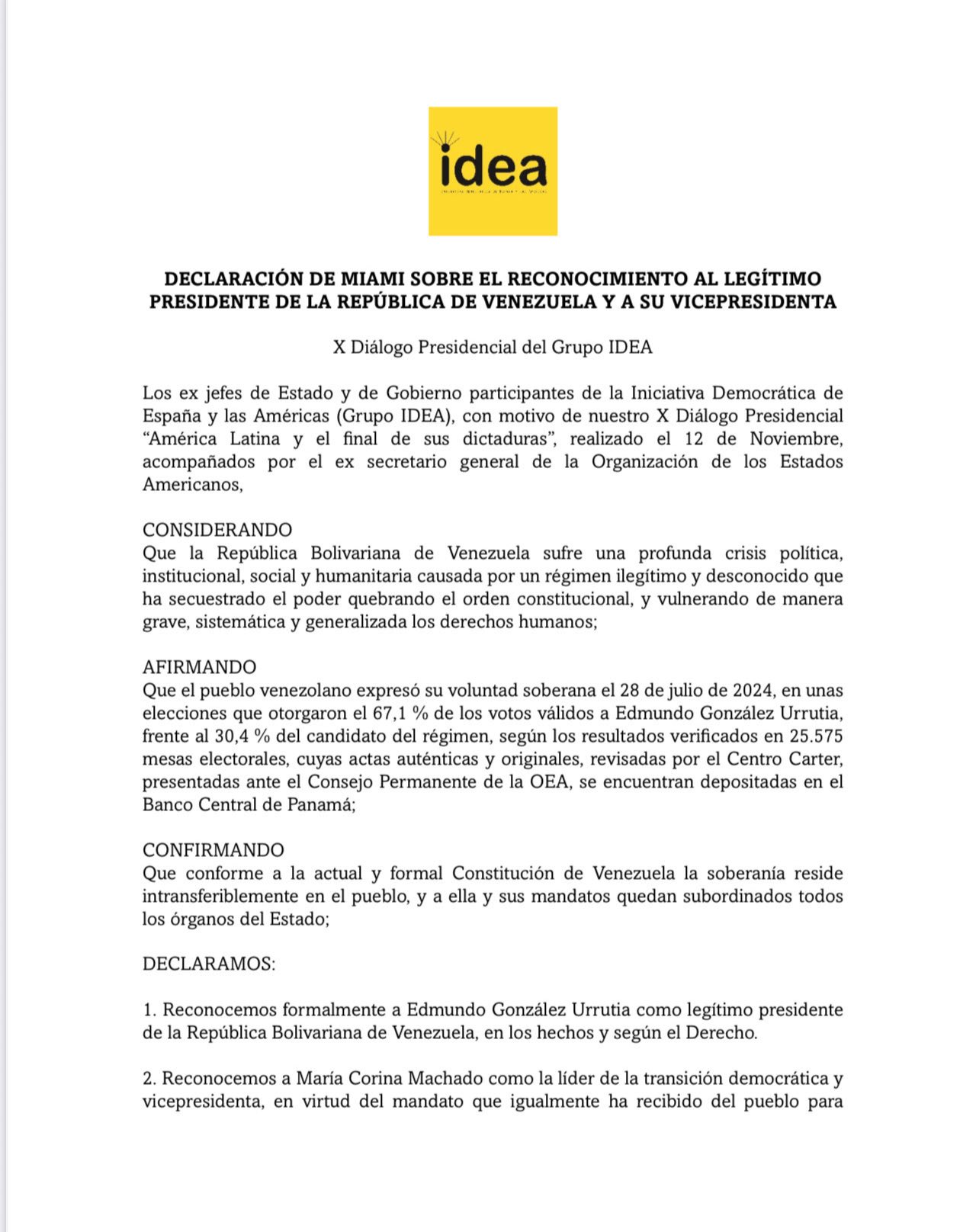 El Grupo Idea, conformado por 31 expresidentes y exjefes de Estado de Iberoamérica, publicó este lunes 17 de noviembre la “Declaración de Miami sobre el reconocimiento al legítimo presidente de la República de Venezuela y a su vicepresidenta”, un documento en el que ratifica su respaldo a Edmundo González Urrutia y María Corina Machado como líderes legítimos de la transición democrática en Venezuela.