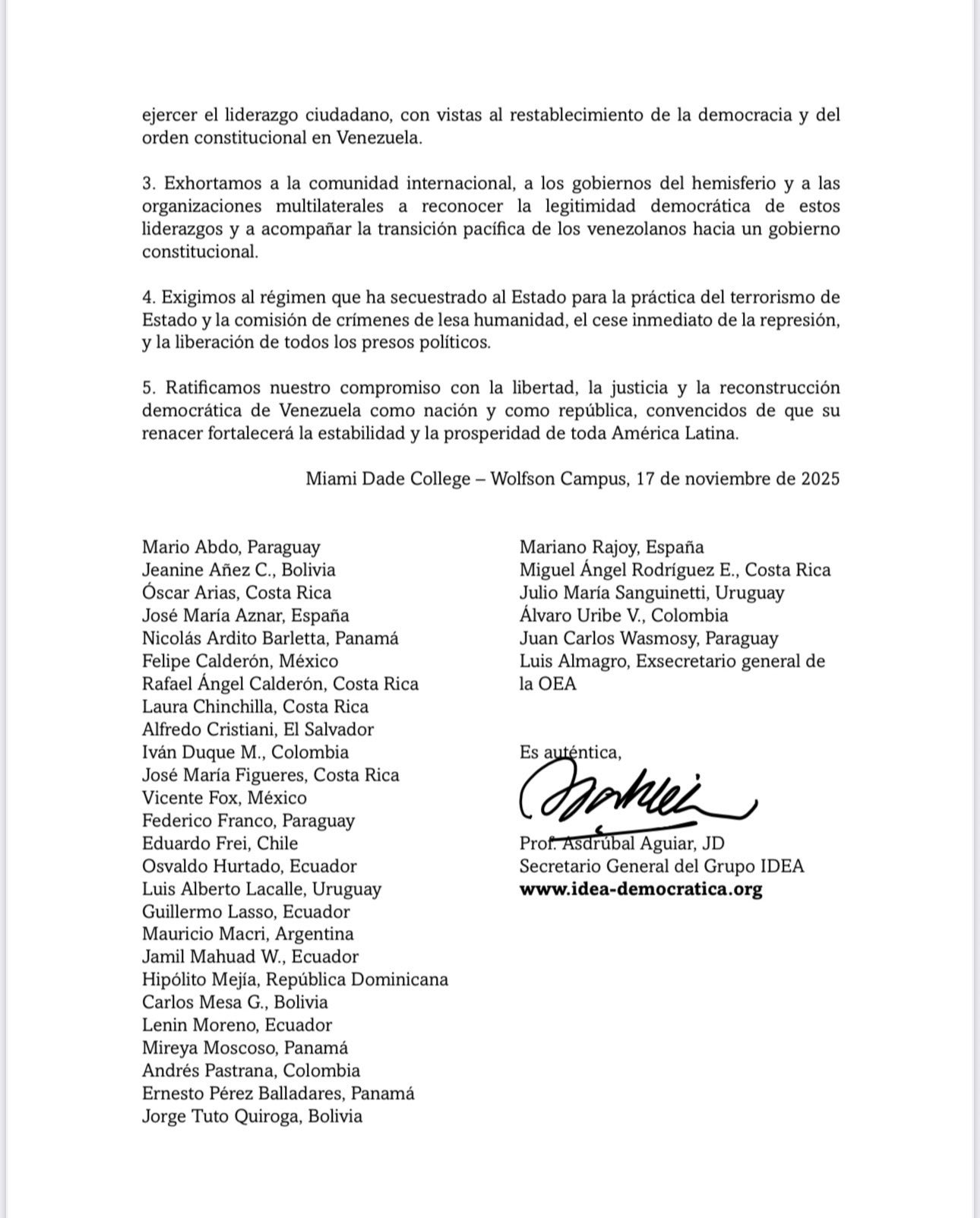 Además, participa el exsecretario general de la OEA, Luis Almagro, y la autenticación del comunicado está firmada por Asdrúbal Aguiar, secretario general del Grupo IDEA.
