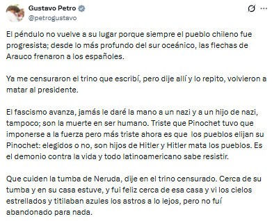 Petro lamentó que el pueblo chileno eligiera a su «Pinochet», comparando a los mandatarios de derecha con figuras históricas nefastas: «elegidos o no, son hijos de Hitler y Hitler mata los pueblos. Es el demonio contra la vida y todo latinoamericano sabe resistir».