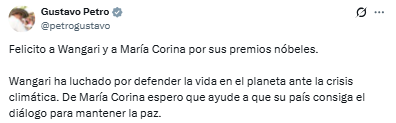 «Felicito a Wangari y a María Corina por sus premios nóbeles,» escribió Petro.