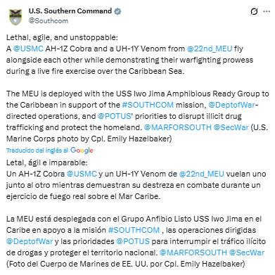 La publicación del Comando Sur se centró en la maniobrabilidad y capacidad de combate de dos tipos de helicópteros del Cuerpo de Marines de EE. UU. (USMC):