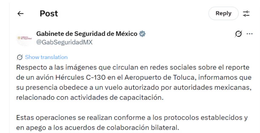 Tras su breve estancia en Toluca, el Hércules C-130 regresó a Texas, desde donde había partido. Autoridades federales comunicaron que “estas operaciones se realizan conforme a los protocolos establecidos y en apego a los acuerdos de colaboración bilateral”, descartando que se tratara de otro tipo de acciones.