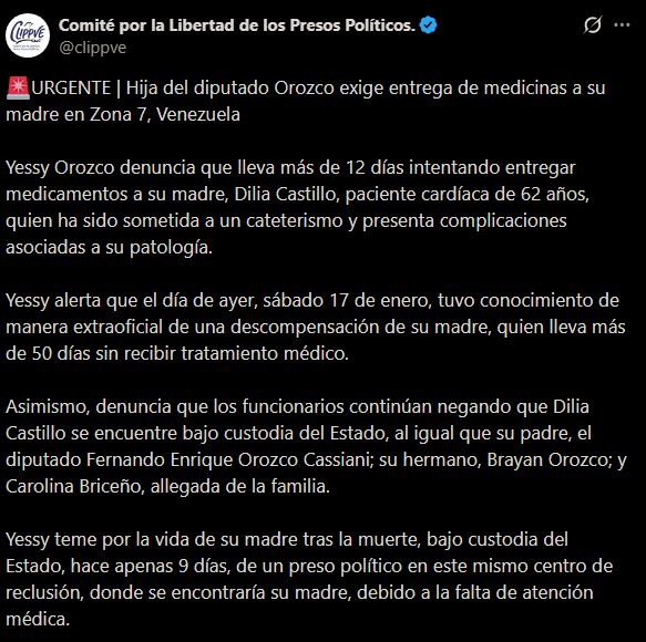 Según relató Yessy en un video compartido en X por el Comité por la Libertad de los Presos Políticos (Clippve), el pasado sábado 17 de enero tuvo conocimiento de manera extraoficial de una descompensación de su madre, quien lleva más de 50 días sin recibir tratamiento médico en la Zona 7 de la Policía Nacional Bolivariana, en Boleíta.