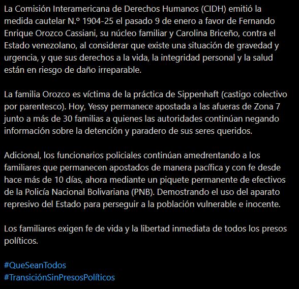 La Comisión Interamericana de Derechos Humanos (Cidh) emitió la medida cautelar N.º 1904-25 el pasado 9 de enero a favor de Fernando Orozco, su núcleo familiar y Carolina Briceño, señalando que existe una situación de gravedad y urgencia que pone en riesgo sus derechos a la vida, la integridad personal y la salud.