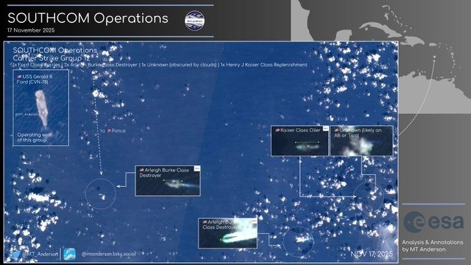 El Grupo de Ataque de Portaaviones 12, liderado por el USS Gerald R. Ford, llegó oficialmente al Caribe Sur y fue confirmado mediante imágenes satelitales del Sentinel-2 de la Agencia Espacial Europea recopiladas por fuentes de inteligencia de código abierto (OSINT) al sur de Puerto Rico este lunes 17 de noviembre.
