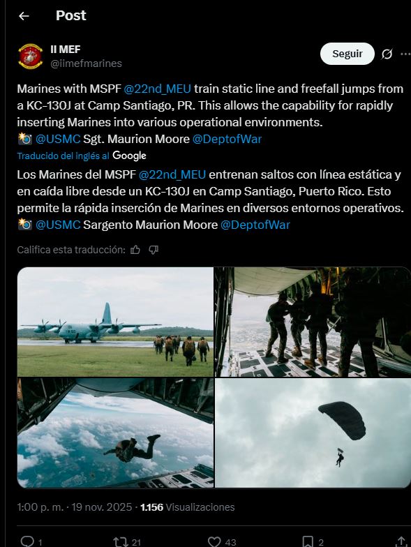 La publicación, realizada en la cuenta oficial de X (antes Twitter) de la unidad, muestra a los Marines de la 22 Unidad Expedicionaria de Marines (22nd MEU) ejecutando saltos con línea estática y maniobras de caída libre desde un avión KC-130J, una aeronave de transporte táctico utilizada para operaciones especiales.