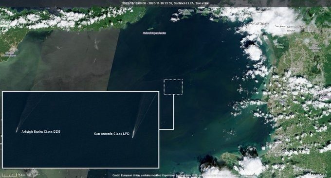 Nuevas imágenes satelitales capturadas por el satélite Sentinel-2 de la Agencia Espacial Europea (ESA) confirmaron la estrecha proximidad de buques de guerra de la Marina de Estados Unidos a las costas de Venezuela y Trinidad y Tobago, específicamente en el área del Golfo de Paria.
