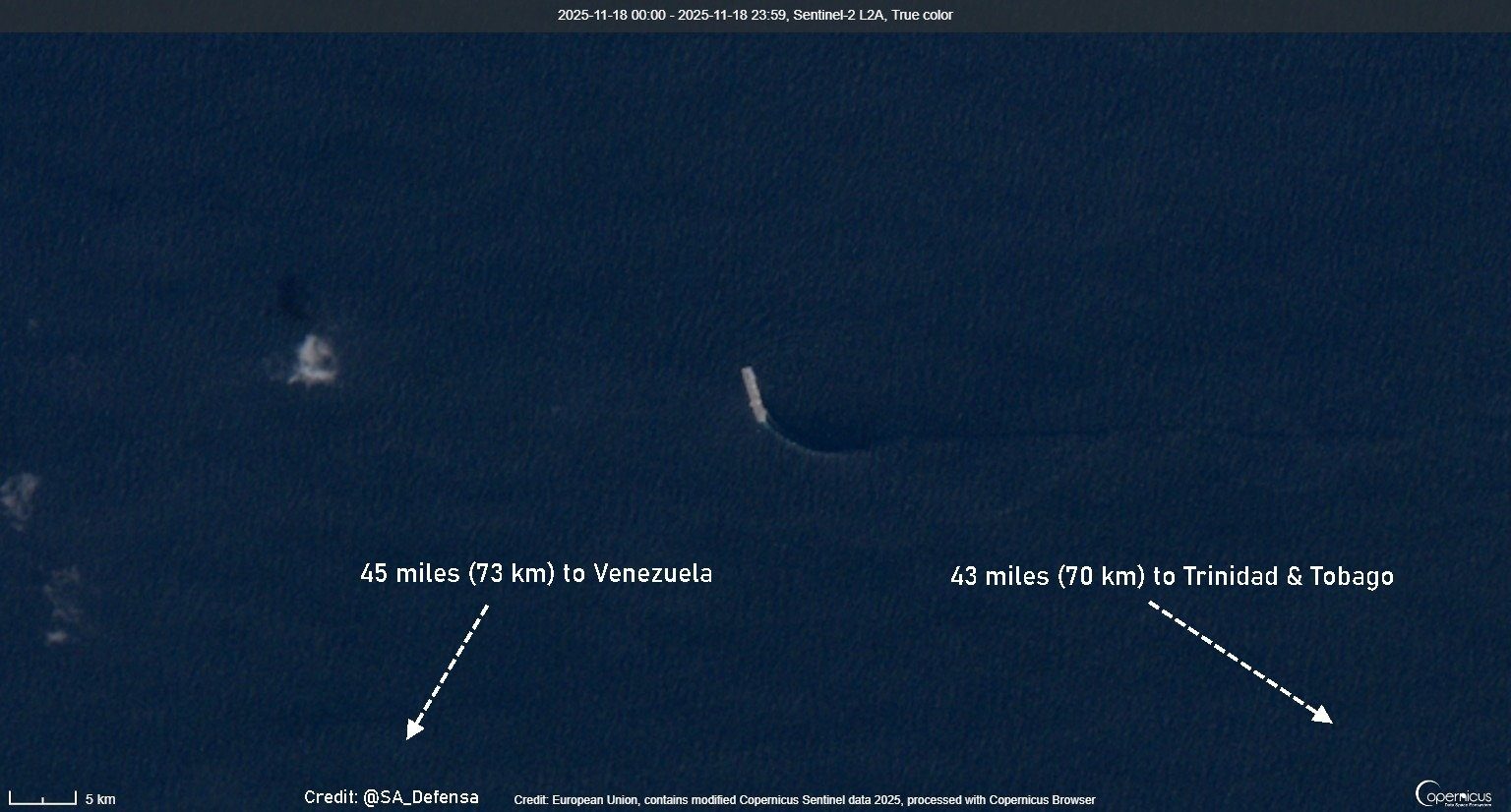 Además, estas unidades se encontraban a tan solo docenas de millas al sur del buque de asalto anfibio USS Iwo Jima (LHD), cuya posición fue registrada a una distancia de aproximadamente 45 millas (73 km) de la costa venezolana y a 43 millas (70 km) de la costa de Trinidad y Tobago.