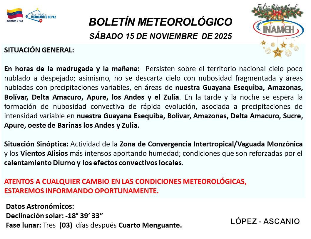 El Instituto Nacional de Meteorología e Hidrología (Inameh) anunció que este sábado 15 de noviembre Venezuela amaneció bajo un patrón de nubosidad parcial, aunque ya se observan mantos nubosos que generan precipitaciones de intensidad variable en zonas de Bolívar, Amazonas, los Andes y el Lago de Maracaibo.