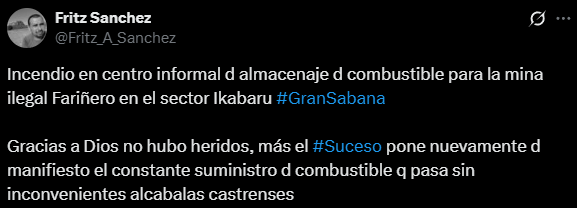«Incendio en centro informal de almacenaje de combustible para la mina ilegal Fariñero en el sector Ikabaru», reportó el periodista independiente Fritz Sánchez en redes sociales.