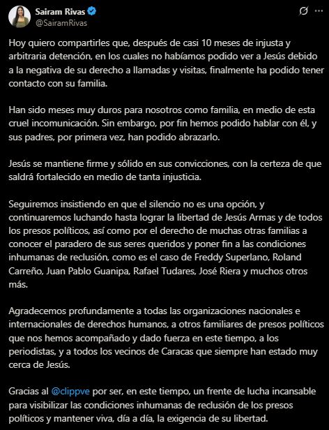 A través de una publicación en su cuenta de X, Rivas explicó que, por primera vez desde su arresto, los padres de Armas pudieron hablar con él y abrazarlo. Agregó que su pareja “se mantiene firme y sólido en sus convicciones, con la certeza de que saldrá fortalecido en medio de tanta injusticia”.
