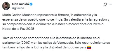 A través de su cuenta en X, Guaidó sostuvo que Machado se ha hecho merecedora del prestigioso galardón por su inquebrantable compromiso con los valores democráticos.