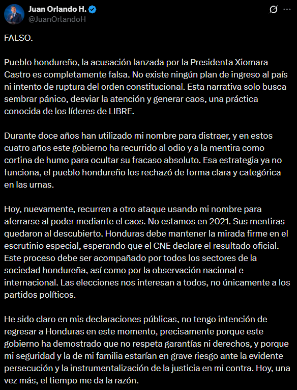 «Pueblo hondureño, la acusación lanzada por la presidenta Xiomara Castro es completamente falsa. No existe ningún plan de ingreso al país ni intento de ruptura del orden constitucional», indicó Hernández (2014-2022) en la red social X.